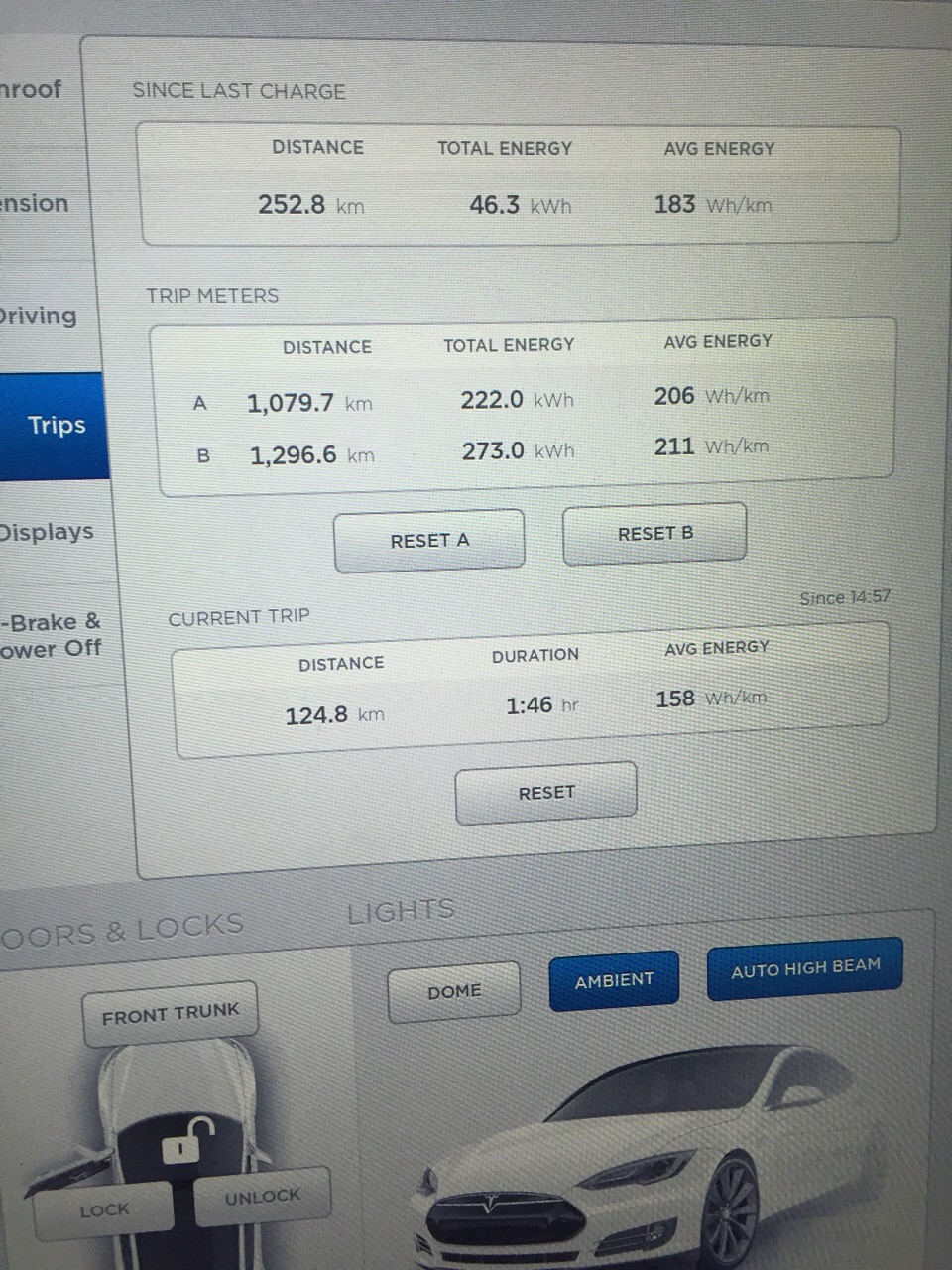 ↑の写真で一番上の段のDistanceがミーティング参加の全走行距離で252.8Km、Total Energyが46.3kWh、AGV ENERGYが183Wh・kmと見えると思います。